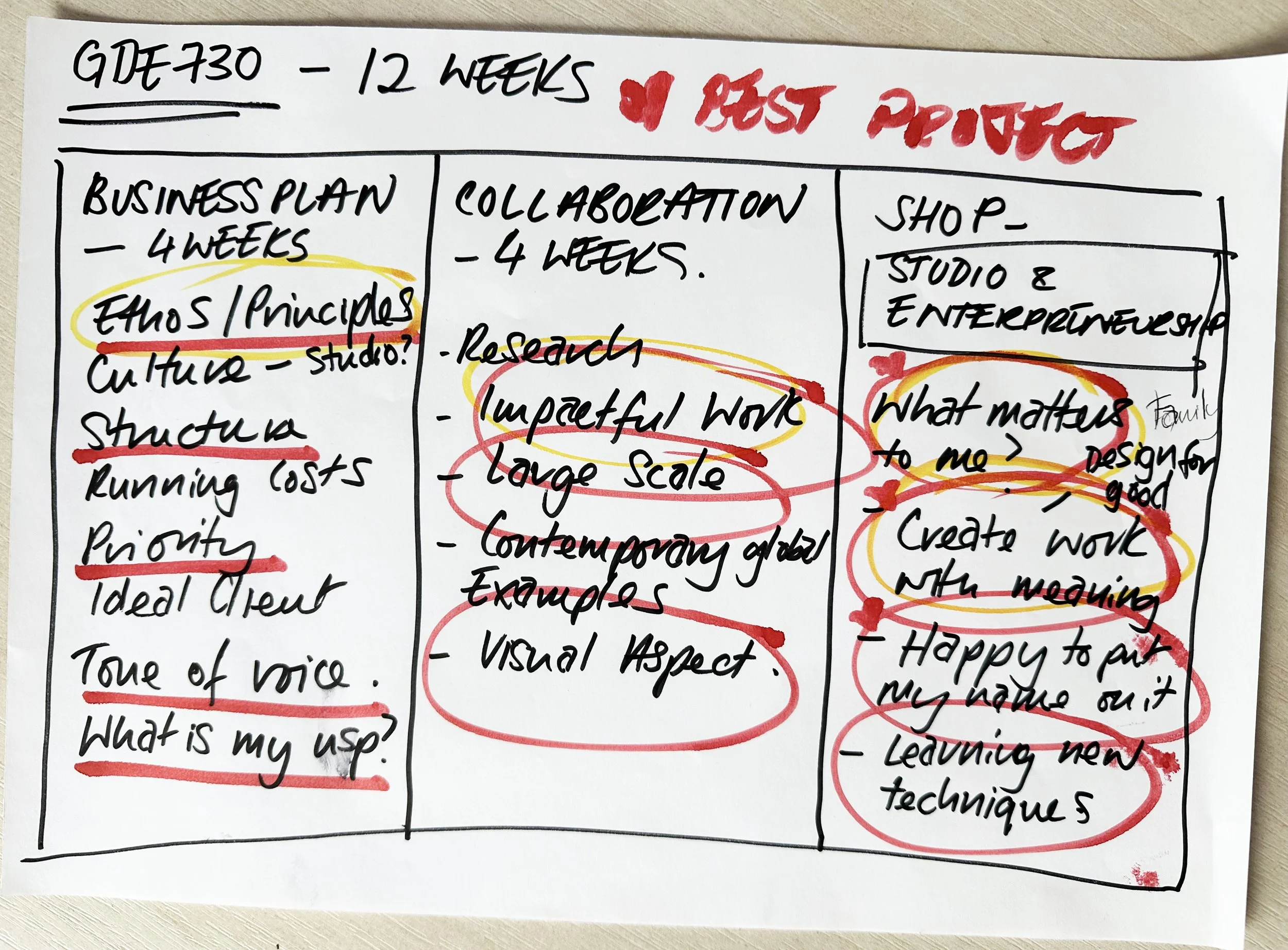This was my favourite module. It was split into three four-week projects: Business plan, Collaboration, Studio, and entrepreneurship.