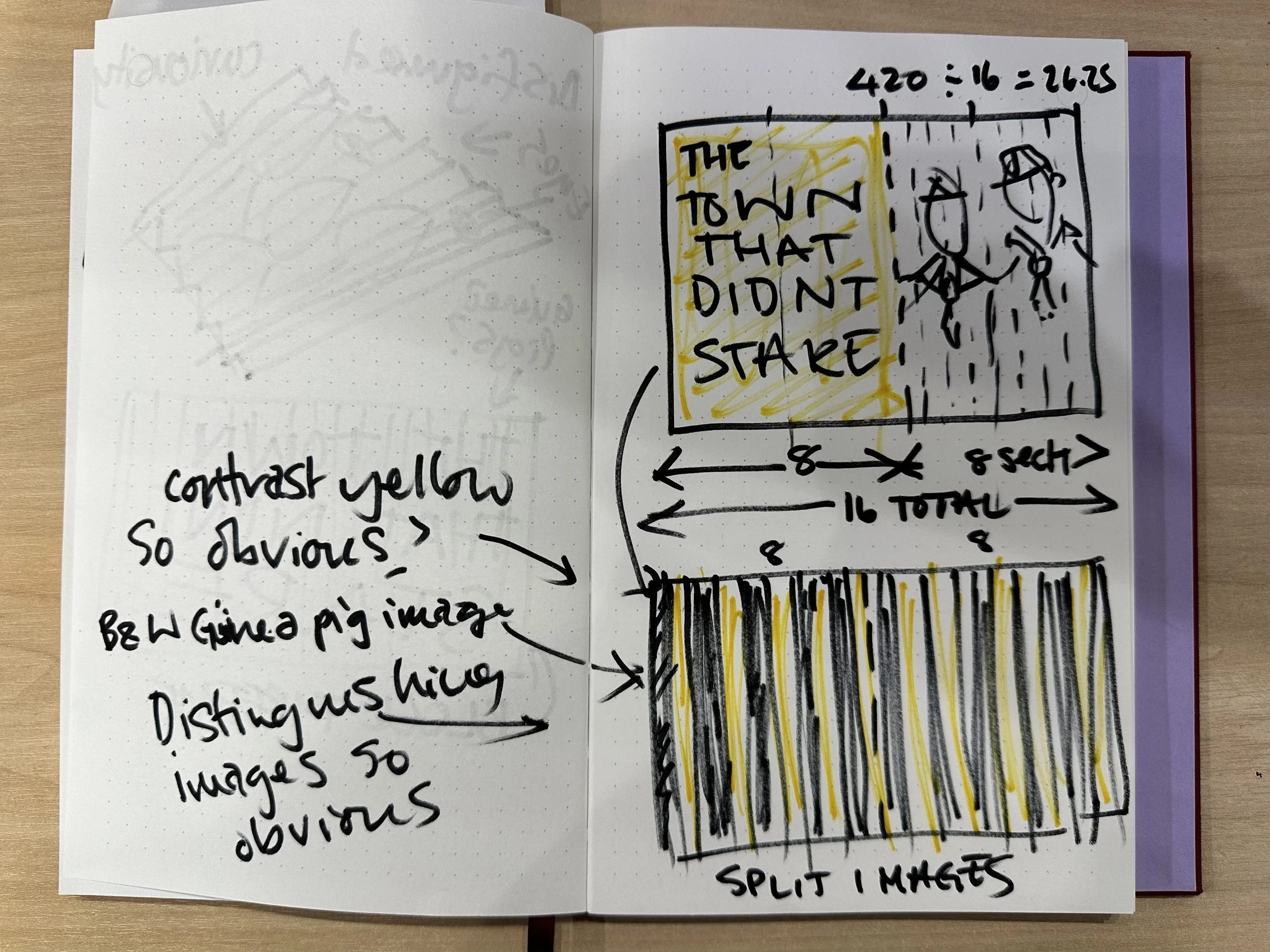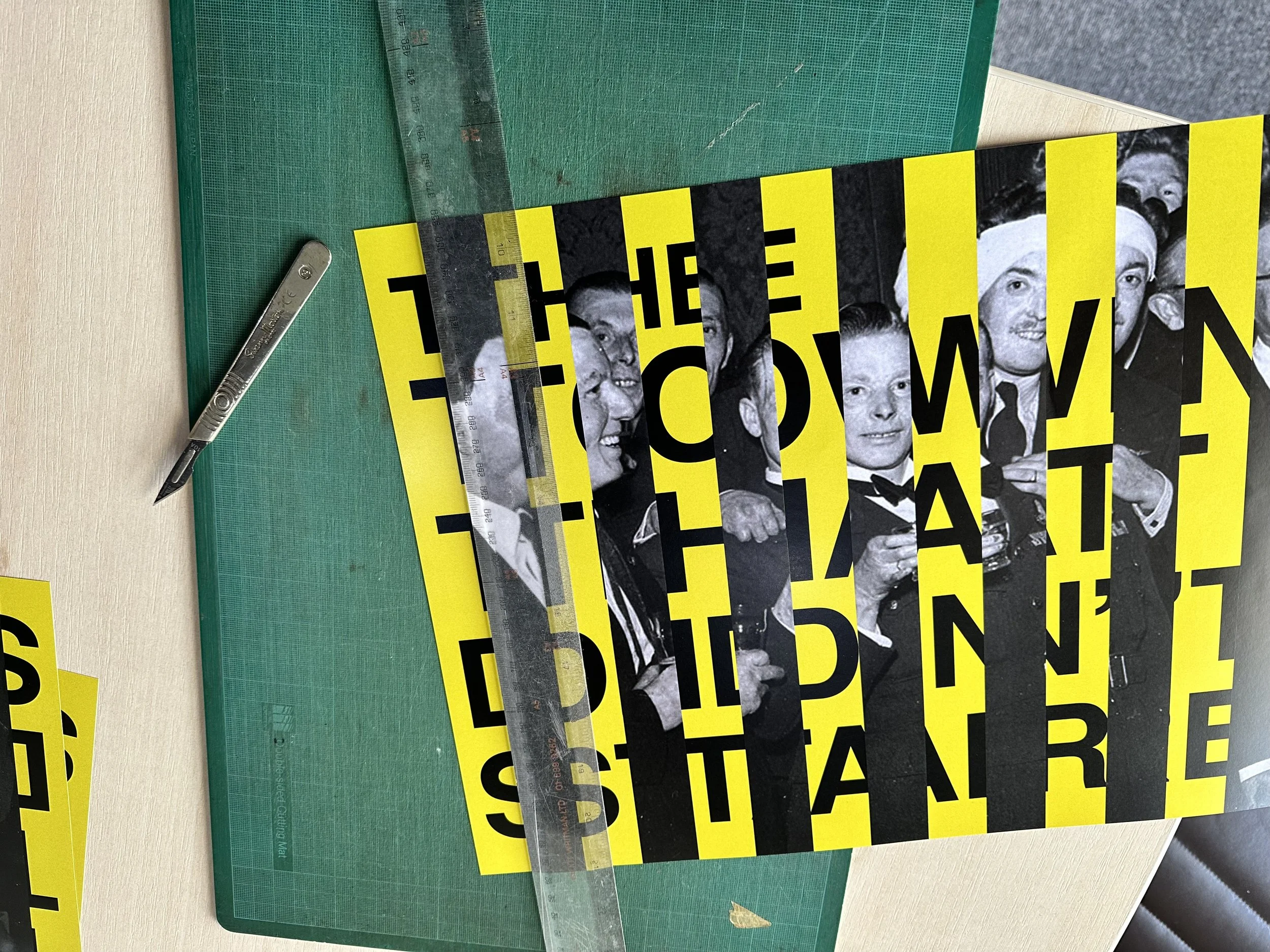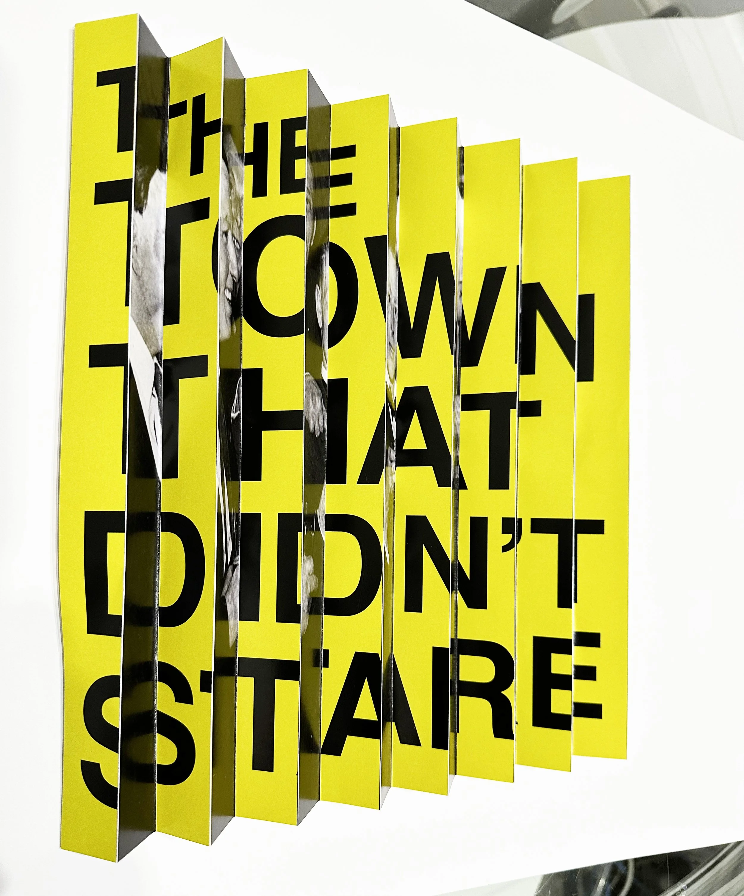 Overview: I started my development by deciding what the two images should be. I realised they need to contrast, otherwise, it would be hard to differentiate between the two. I loved the quote ‘the town that didn’t stare’ so this would be my typographic solution on one half, and as all the photographic images from this era were in black and white, I made my typographic solution a bright yellow background so the contrast was clearly visible.